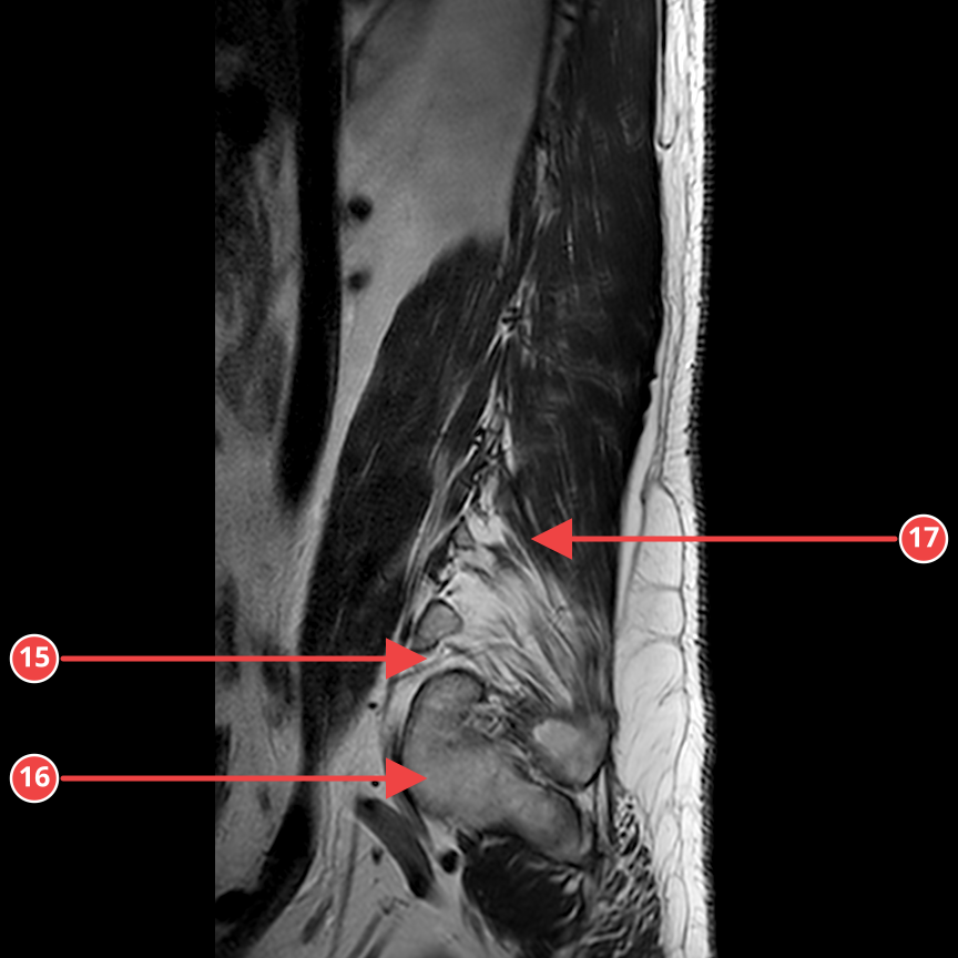 МРТ пояснично-крестцового отдела позвоночника и тазобедренных суставов в сагиттальной и коронарной проекциях на последовательностях T1W SE и T2W TSE. Качество визуализации достаточное для оценки костных и мягкотканных структур.