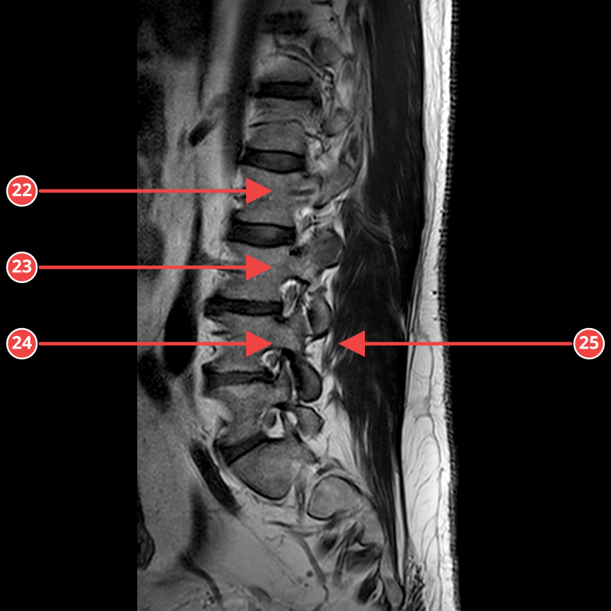 Сагиттальная T2-взвешенная последовательность пояснично-крестцового отдела. Видна центральная грыжа L5-S1 с компрессией дурального мешка и небольшая протрузия L4-L5. Остальные диски в пределах возрастной нормы.
